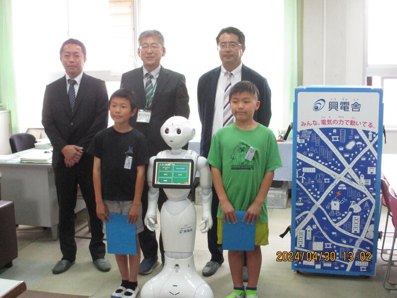 興電舎様からお借りする人型ロボット「ペッパー」の贈呈式がありました。興電舎の甲斐社長より「いろいろなことに関心を持ち、勉強をがんばってほしい」と激励いただきました。代表児童2名が「プログラミング学習をがんばり、自由に動かしたり、一緒に苦手教科の知識を身に付けたりしたい」と抱負を述べました。これから様々な授業でペッパーを活用していきたいと考えています。