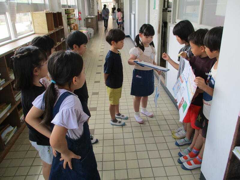6日(木)と7日(金)に2年生が、学校にある職員室や音楽室などの特別教室の紹介を1年生にしました。お兄さん、お姉さんになった2年生が事前に各教室を回り、どんなものがあるのかを見たり、どんなことをする教室なのかを先生に聞いたりして調べました。調べたことをもとにポスター役や発表係、誘導係を分担して1年生に学校の紹介をしました。1年生は2年生から教えてもらったことをよく聞いて、何をする教室なのかを確かめることができました。