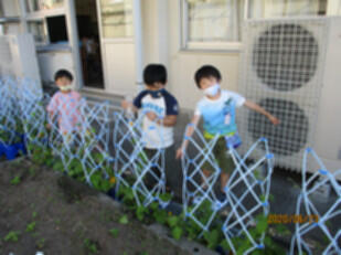 6月も下旬に入り、気温も暑い日が多くなりました。1年生のアサガオもつるが伸び、支柱を立てています。つぼみも少しずつついてきていて、いつ花が咲くのか楽しみです。