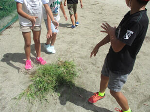 今日の1・2校時は4年生は、涼しい時間帯で体育の授業をしました。徒走のタイム計測をしましたが、休み時間などに、夏休みで生えてきた運動場の草をたくさん抜いてくれました。抜いた後の穴も、他の学年が躓かないように埋めてくれました。