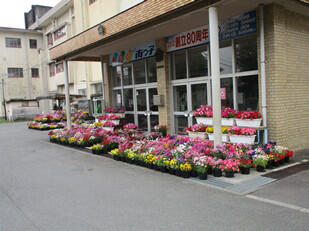 入学式で使用した花々が、子どもたちが早く学校に来るのを待っているかのように学校玄関に咲き誇っています。
