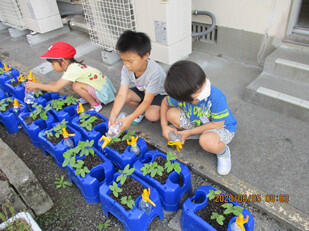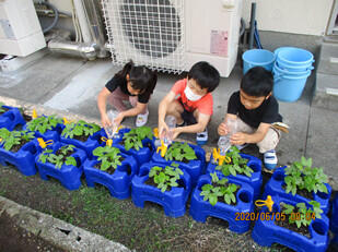 オクラは、花が咲きました。ナスは実がなり、花も咲いています。一人一鉢で育てているミニトマトも背丈が伸び、黄色い小さなかわいい花がさいています。