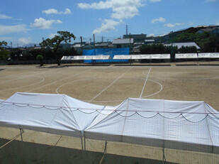 まだ日差しがきつい日が続いていますが、水曜日の第1回の練習に向けて職員と6年生で運動会のテントをたてました。