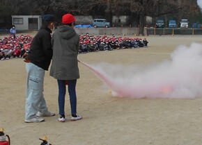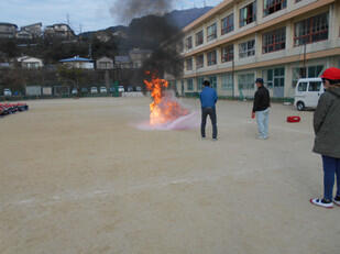 中村消防株式会社の協力を得て、火災の避難訓練と併せて消火器の使い方などを学びました。