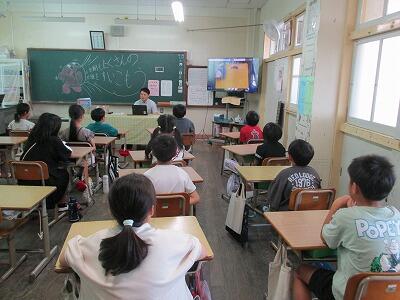アメリカのことを教えてもらったり、英語の発音を聞いてまねしたりと外国語に触れるよい機会となりました。子どもたちはとても楽しそうな雰囲気で学習していました。