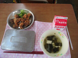 今日は「みやざき地頭鶏(みやざきじとっこ)の唐揚げ」でした。とても味がしっかりしていて量も多く、みんなお代わりをしていました。
