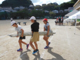 まだ日差しがきつい日が続いていますが、水曜日の第1回の練習に向けて職員と6年生で運動会のテントをたてました。