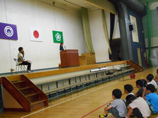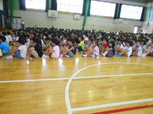 740名が体育館に集まると壮観です。みんなしっかりと友だちの発表や先生の話を聞くことができました。