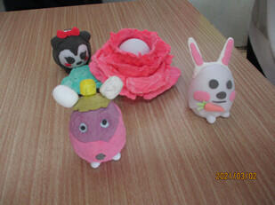 ライトの色が自動で変わる卵型のプラスチックの型に、自分で着色した紙粘土を付けていろいろなキャラクター的なものを作成する内容です。
