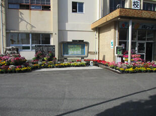 入学式で使用した花々が、子どもたちが早く学校に来るのを待っているかのように学校玄関に咲き誇っています。