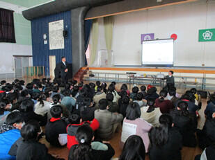本年度は、日新興業株式会社代表取締役社長の河野孝夫様に講話をしていただきました。本校は、人数が多いので2クラスずつ2回に分けて実施していただきました。
