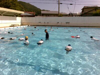 服を着た状態で水に落ちた状況を体験してみて、泳ぎにくさであったり、落ち着いて行動すれば命が助かることを実感したりするための学習です。本校では、毎年、2、4、6年生が体験しています。