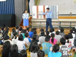 5月14日(火)に、警察、交通安全協会の方の協力を得て、交通教室を実施しました。雨が予想されたので、体育館で実施しました。本校は人数が多いので、低・中・高学年別に3校時で実施しました。