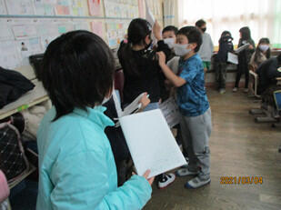 4年生は、国語の学習でいろいろアンケートをとって、それをグループでまとめて、みんなに発表する学習をしています。