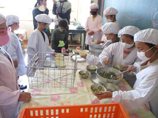 2年生は、今週から給食当番をしています。5年生・4年生の数名の応援をもらいながら、おかずをついだり、パンや牛乳を配ったり、上手にできています。
