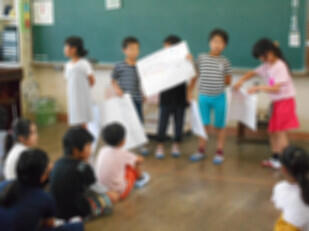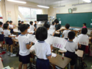 4学級のそれぞれの班が混じって、3つの教室で発表しました。知らない教室で知らないお友達に発表するので少し緊張している子どももいました。