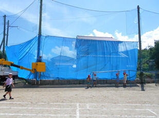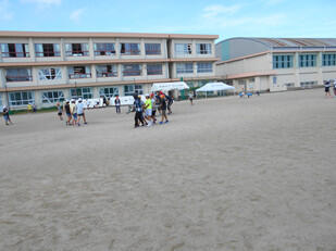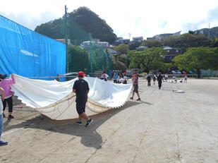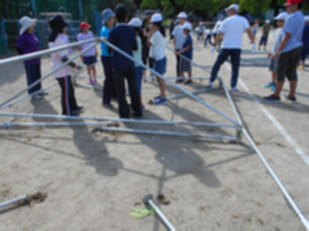 まだ日差しがきつい日が続いていますが、水曜日の第1回の練習に向けて職員と6年生で運動会のテントをたてました。