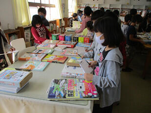 学校図書館に新しく購入する本を決める3年生の選書会がありました。新しい本を3冊選ぶことができます。選んだら好きな本を読む時間もありました。