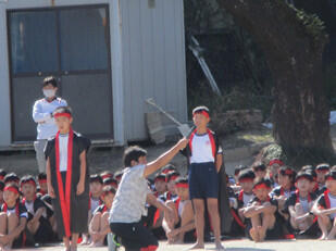 本日は、体育科学習発表会の2日目、1・2年の発表会でした。1年生にとっては、南小の運動場でする初めての内容になります。みんな一生懸命練習をしてきました。