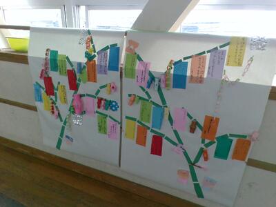 3年生の教室前廊下に、飾り付けられた竹の絵と子どもたちの願いごとが書かれた短冊が掲示してありました。