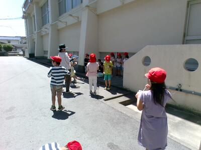 生活科の学習で、シャボン玉遊びを楽しんでいる1年生の様子です。