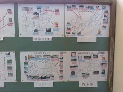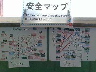 子どもたちが住んでいる地域を調べに行き、それぞれの地区の危険な場所、安全な場所をまとめたものです。