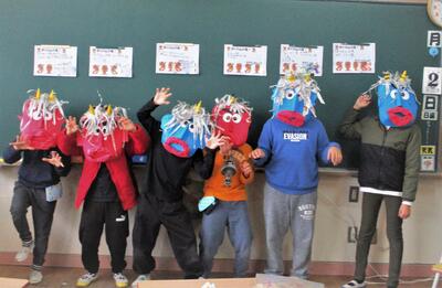 今日は6組さんが手作りの鬼のお面をかぶって、校舎内の鬼払いをしに来てくれていました。