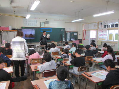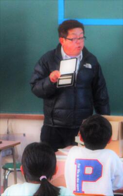 珍しい高価なそろばんなどを見せてくださいました。児童は興味津々!