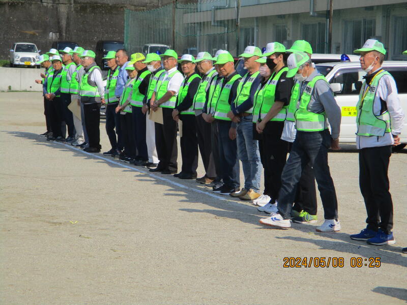 27名の隊員の方に来ていただき、子どもたちとの顔合わせをしました。登下校の際にはいつも子どもたちに声をかけていただいたり、不審者等がいないか見回りをしていただいたりしています。
