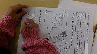 12月2日(火)、2校時に職員参観月間の1年生の国語科授業が行われました。物語文「たぬきの糸車」で、場面の様子に着目して、登場する人物の行動や思いを想像しながら読む学習です。子どもたちは、お話の世界に浸りながら、「どこからそう思ったのか」「なぜそう思ったのか」など、考えたことを友達と伝え合って深めることができました。言葉への着目の仕方をどんどん学んでいる1年生です。