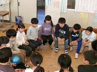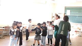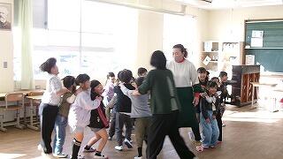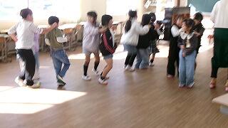 1年生は音楽です。「ジェンカ」の曲に合わせて、みんなでリズミカルに楽しんでいます。