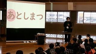 2年生が、生活科まちたんけんのまとめの発表をしていました。クイズを出して工夫しています。