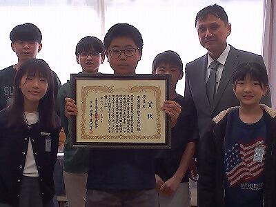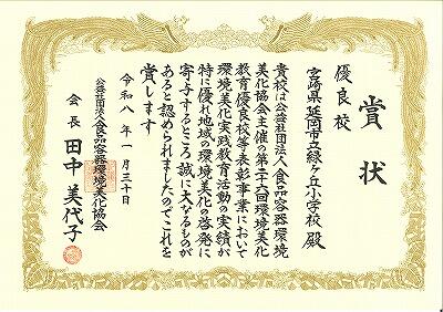 今年度、アカウミガメを守るために、6年生を中心にした全校児童が、地域や保護者の方々と一緒に、長浜海岸の清掃を行うなど、主体的に環境を守る活動に取り組んだ実績が認められ、標記の賞をいただきました。県の担当者から6年生の代表児童に表彰状が手渡されました。本賞は、環境美化教育に熱心に取り組み、地域社会と連携しながら活動する学校を表彰するものです。県内からは、緑ヶ丘小1校だけの受賞ということです。保護者・地域の皆様に支えられ、児童が主体的に取り組んだ結果です。本当に有り難いことです。