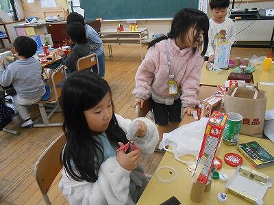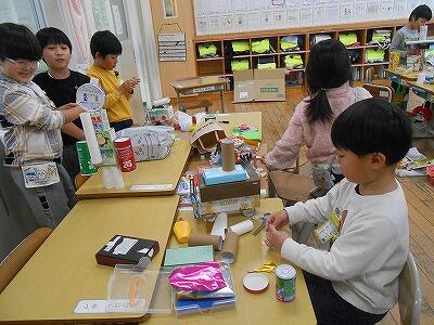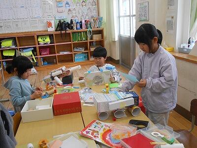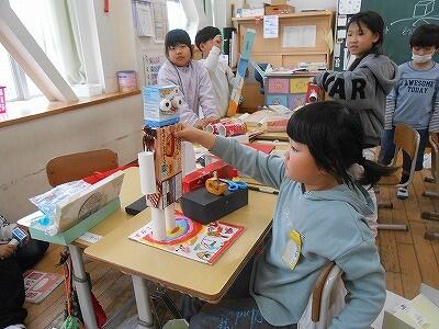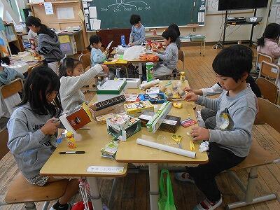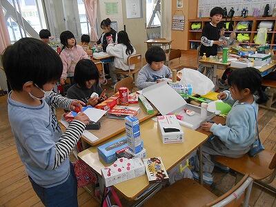 1年生の図工の時間の様子です。いろんな形の箱で一体何ができるかな。夢中になっています。