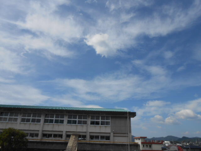 直撃を免れたので被害はありませんでした。子どもたちには、ここで台風とは、とか風向きはどうだとか、大人の経験談をたくさん話していただくと、子どもたちの知識になります。勉強を教えると言うより経験談をたくさん話してください。皆様に被害がなかったことを祈念しております。写真は朝6時の学校西方の空です。青空もすこしみえましたが・・・。