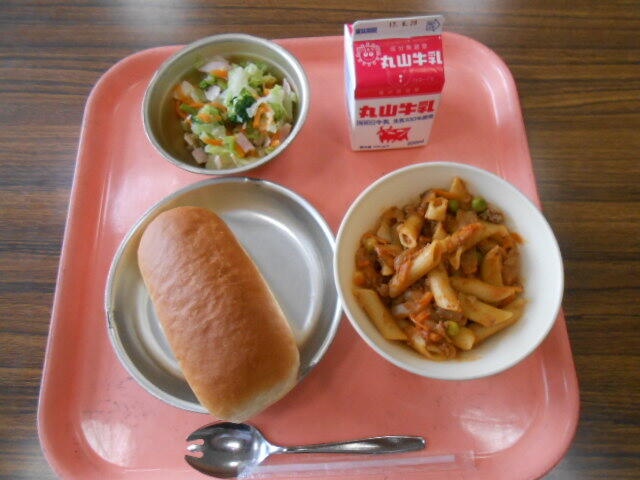 今日のメニューは、ハムサラダ、ペンネポロネーゼ、コッペパン、牛乳でした。