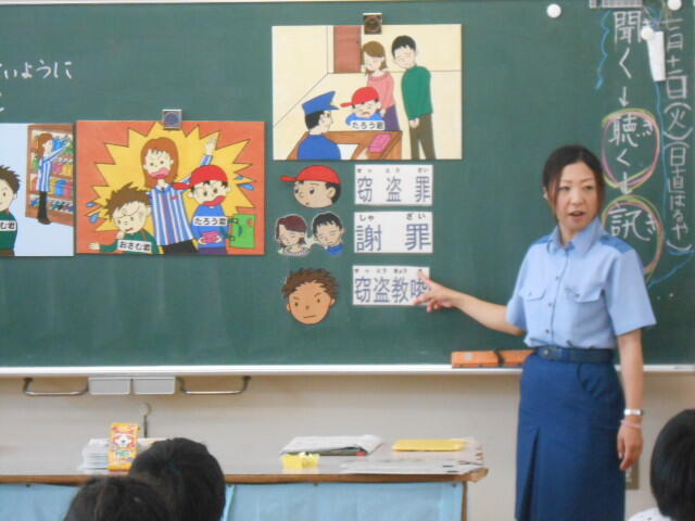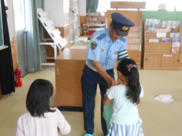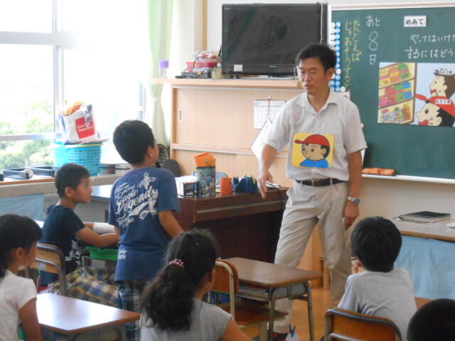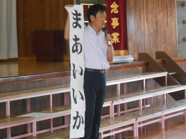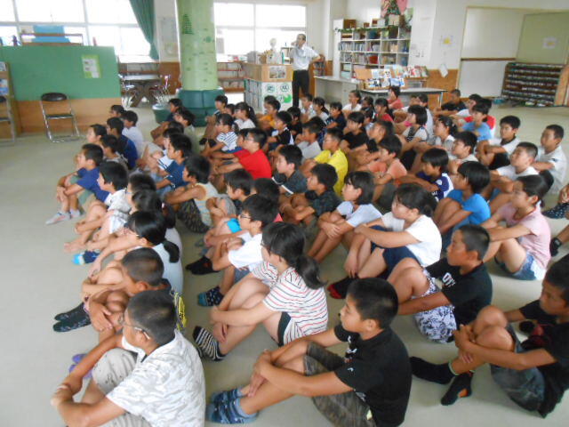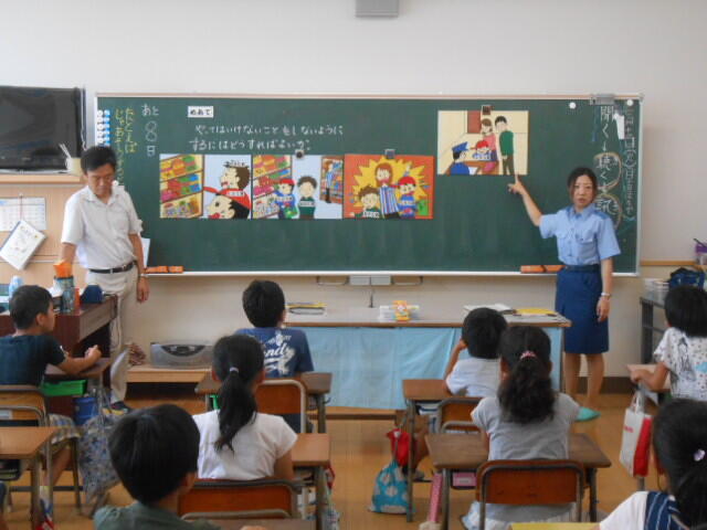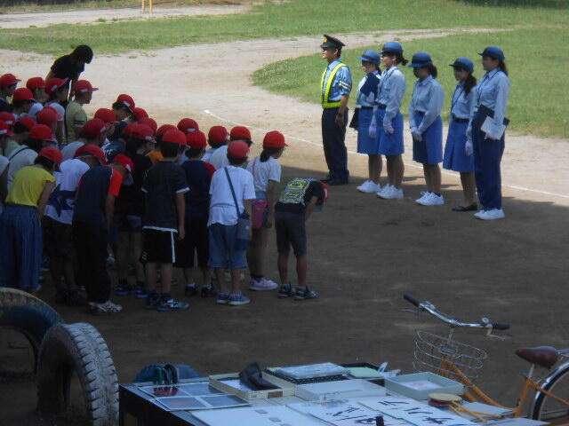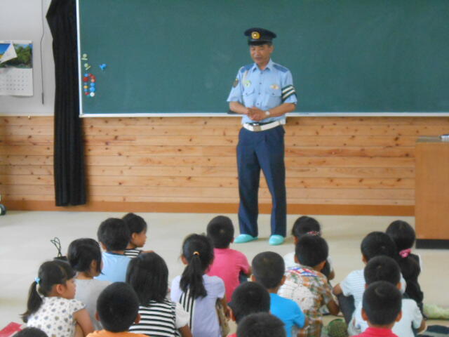 19日(水)の朝に、延岡警察署から森山警部補に来ていただき、説明と準備してこられたものを受け取りました。2年生に限らず、長い夏休みの間におじいさんやおばあさん、または親戚の方々に会う機会もあるかと思います。「交通事故に気をつけてね」と互いに声を掛け合うのもほほえましいことだと思いました。温かい交流があるといいと願っています。