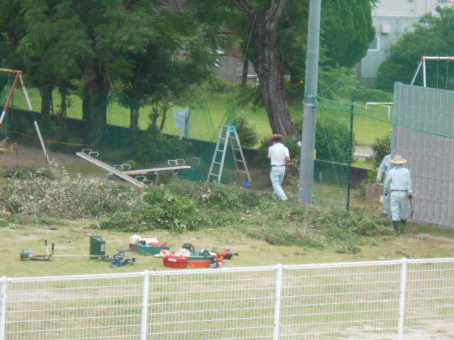 そのような中、プール脇の大きな木々を技術員さん方が剪定してくださいました。大きくなりすぎると共に、蜂の巣がいくつもできたり、地域の方の庭に落ち葉を落としてしまったり、手に負えなくなる寸前でした。