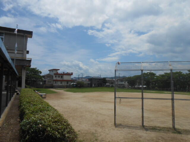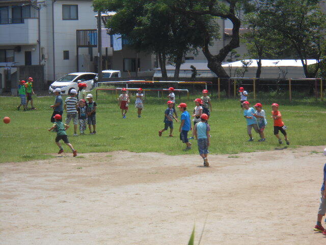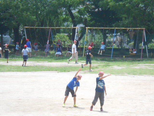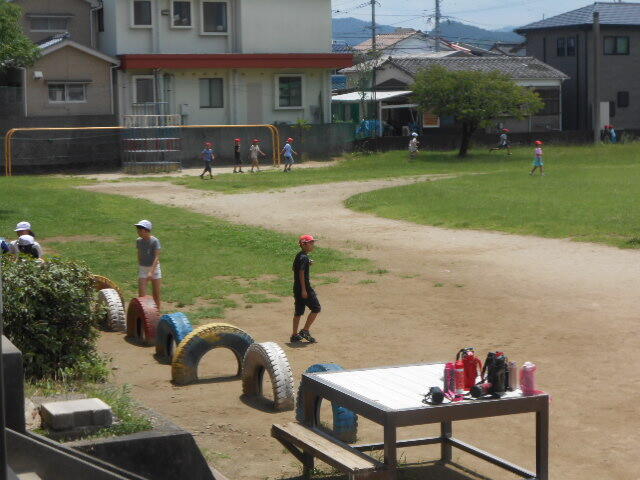 1年生は肩に水筒を下げて出てきました。他の学年は、水筒をそばに置いて遊んでいました。しっかり対策を取って過ごす子どもたちでした。120人ほどが運動場に出ていました。