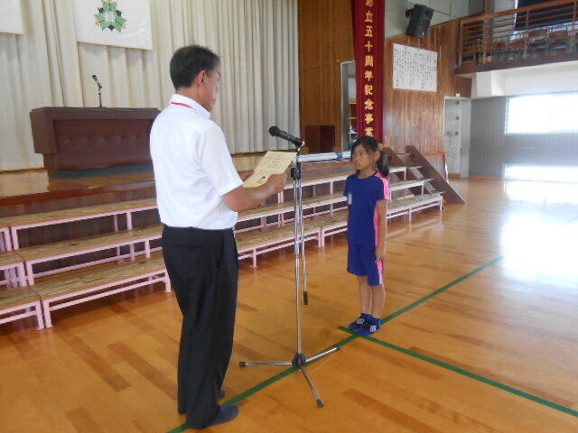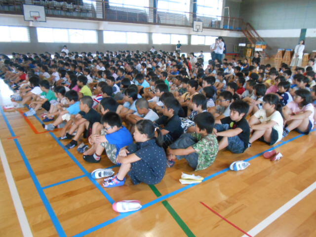 ついに1学期が終わりました。体育館に移動して終業式です。始めに到着していたのは1年生と4年生。静かに、じっと座って他の学年の到着を待っています。4月と比べてずいぶん成長したなと思いながら見ていました。