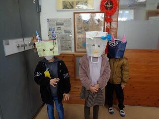 2月3日(金)今日は節分です。鬼のお面をかぶった子どもたちが校長室を訪問してくれました。