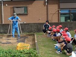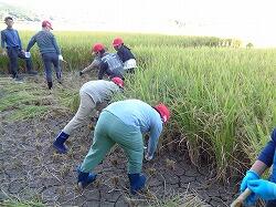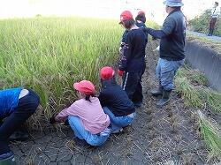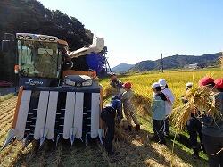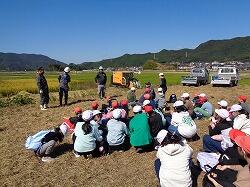 10月23日(月)5年生が稲刈りをしました。田植えをしてから約半年、たわわに実った稲に子どもたちもびっくりしていました。まずは、一人一人が鎌を持ち手刈りをしました。多少ぎこちないものの、みんな一生懸命刈り取っていました。その後、機械で脱穀もしました。手刈りの残りは、大型コンバインであっという間に刈り取られ、その後、薬剤散布用のドローンやヘリコプターの実演も見せていただきました。手刈りで苦労しただけに、最新機械の性能にみんなびっくりでした。お世話になった農家の方は、田植えから毎日田んぼを見に来てくださったと聞きました。毎日見に来られる方の稲は育ちがよいと言うことも聞き、手と愛情をかけることの大切さも分かったと思います。米作りの苦労のほんの一部しか体験していませんが、ごはんを食べられることへの感謝の気持ちが高まったにちがいありません。
