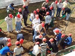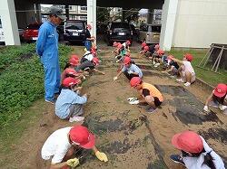 10月20日(金)3年生が「空飛ぶたまねぎ」の苗を植えました。先日講話をしていただいた農家の方に再び来ていただき、学校内の畑に1人十数本の苗を植えていきました。先日見た小さな種から苗ができ、さらに成長してタマネギになる。その成長と、農家の方の苦労や楽しみが少しでも感じられるように、大切に育ててほしいと思います。
