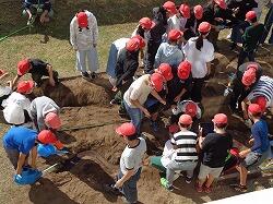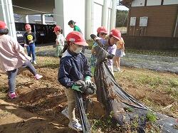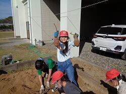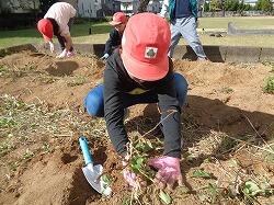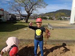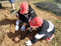 11月8日(水) 2年生がいもほりをしました。1学期につるを植えてその成長を見守ってきました。マルチをはいで掘ってみると大きなサツマイモがごろごろ出てきました。あまりの大きさで1人では掘り出すことができず、みんなで協力してほりあげていました。大収穫にみんな満足そうでした。