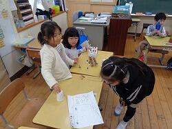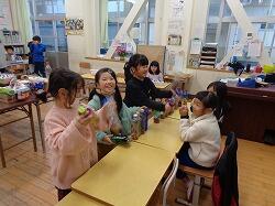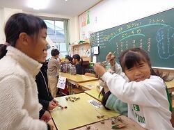 12月5日(火) 1年生が生活科で「だいすき!コレクションランド」を開きました。こんは、秋を探そうで集めたドングリを使って、アクセサリーやゲームをつくり、みんなを招待して遊ぶというものです。たくさんのドングリで、すてきなアクセサリー、マラカス、かわいいマスコット、的当て、けん玉、魚釣りゲームなどをつくっていました。そして、先生方や2年生に招待状を配り、応対もしっかりしながらみんなをもてなしていました。1年生とは思えないクオリティーの高さで、たくさんの笑顔があふれていました。