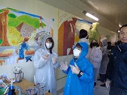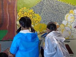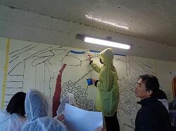 12月27日(火) 南中学校青少年育成協議会主催の塩浜地下横断歩道壁画プロジェクトが行われました。このプロジェクトは、何年も前から実施されており、暗いイメージの地下道を少しでも明るくしようということで始まったものです。コロナ禍でしばらくできませんでしたが、今年は久しぶりに実施となり、一番東側の絵を描き換えることになりました。南中を卒業した高校生の原画を基に、南中学校美術部の生徒さんが中心となり、南小学校、緑ヶ丘小学校の児童も参加して行われました。本校からも5・6年生が5名参加しました。とても寒い日でしたが、子どもたちは一生懸命描き、延岡の魅力を集めたすてきな絵が出来上がりました。