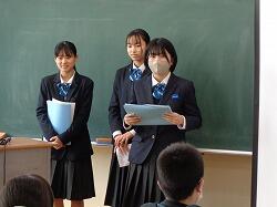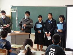 1月30日(火)南中学校の生徒会のみなさんと先生方に来ていただき、6年生に向けて中学校に向けてのお話をしていただきました。始めに、生徒会長をはじめ役員の3名が、中学校に向けて不安も大きいでしょうが、とても楽しい学校生活が待っているので楽しみにしてほしいという話をしました。その後で先生方が、中学校の3年間は人生の大きな岐路になること、そのためにはしっかり目標をもって、小さな事も大切にしながら頑張ってほしいことを話してくださいました。生徒会の3人は、すべて緑ヶ丘出身の生徒です。今の6年生も小学校の頃からよく知っている先輩です。凜として語る姿を見て、中学校での成長を感じると共に、先輩へのあこがれと中学校への希望が大きくなったにちがいありません。