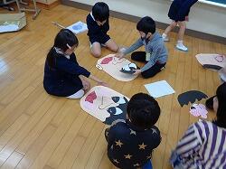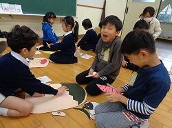 2月1日(木) 1年生とウルスラ幼稚園年長さんとの交流学習がありました。1年生は、何日も前から準備してとても楽しみにしていました。福笑い、かるた、すごろく、紙相撲など、1年生がリードしながら進めて行きました。幼稚園生をリードする1年生はとても頼もしく、1年間の成長を感じました。1年生も幼稚園生もにこにこ笑顔の活動でした。