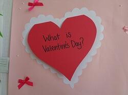 2月7日(水) 昨日、ALTの先生が、イングリッシュルームにバレンタインデーに関する掲示物を作成してくださいました。かわいいハートのカードに英語で問題が書いてあり、めくると答えが日本語と英語で書いてあるものです。バレンタインデー=チョコレート しか知らない児童もいるかもしれません。日本と外国の文化について考える機会にもなると思います。