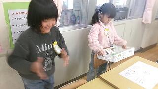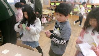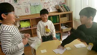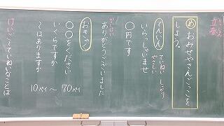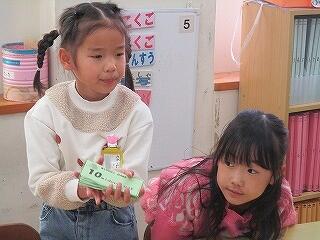 2月4日(水)、1年生が国語「ものの名前」で学習した言葉を生かして楽しいお店やさんごっこを開いていました。甲斐先生の手作りバージョン「10midori ペイ」をお小遣いにもらって、みんな大喜び!算数の100までの数のお勉強も生かして、買い物をしたり、お店やさんになったり。大繁盛のお店屋さんごっこでした。